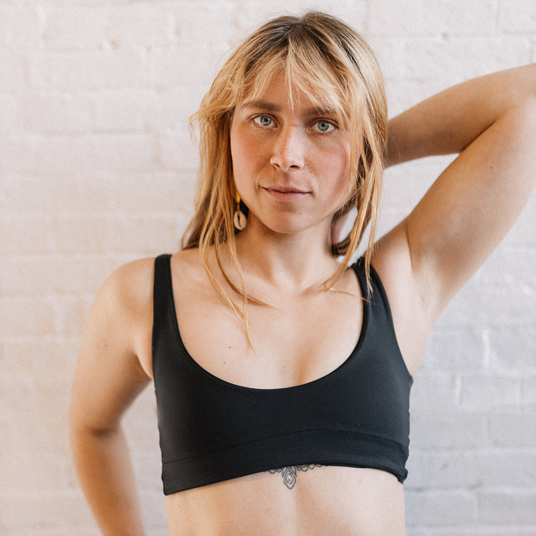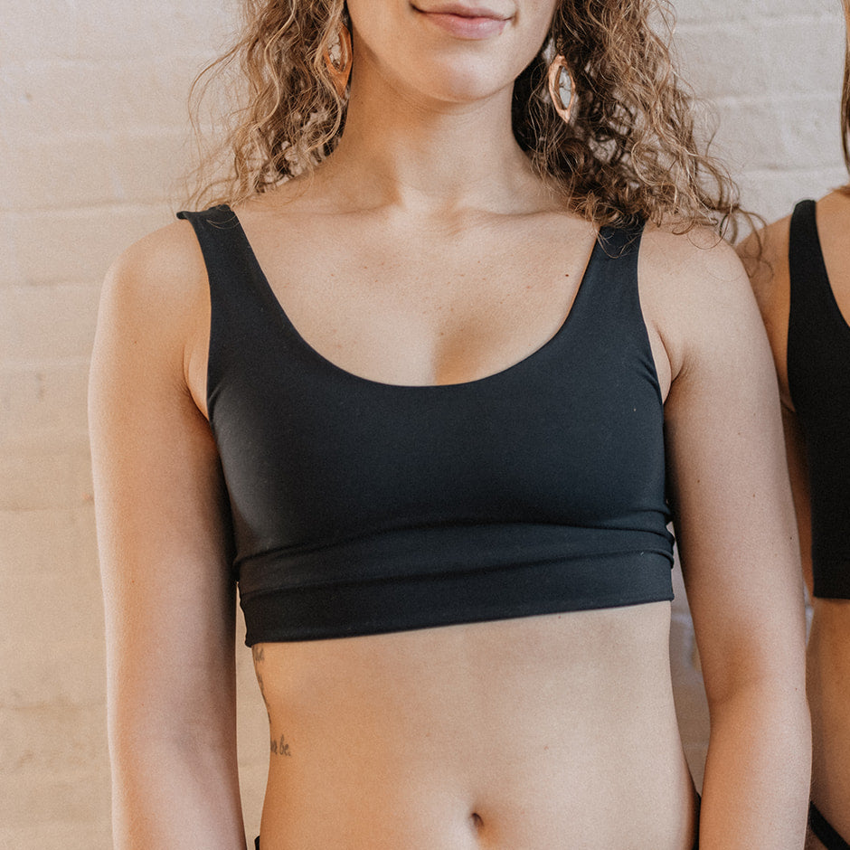 An official sports bra top, with a scoop back. Wear it backwards for less coverage. It is supportive and functional for almost any occasion. A perfect pair with high-waisted pants or shorts. 4-ways if ordered reversible!